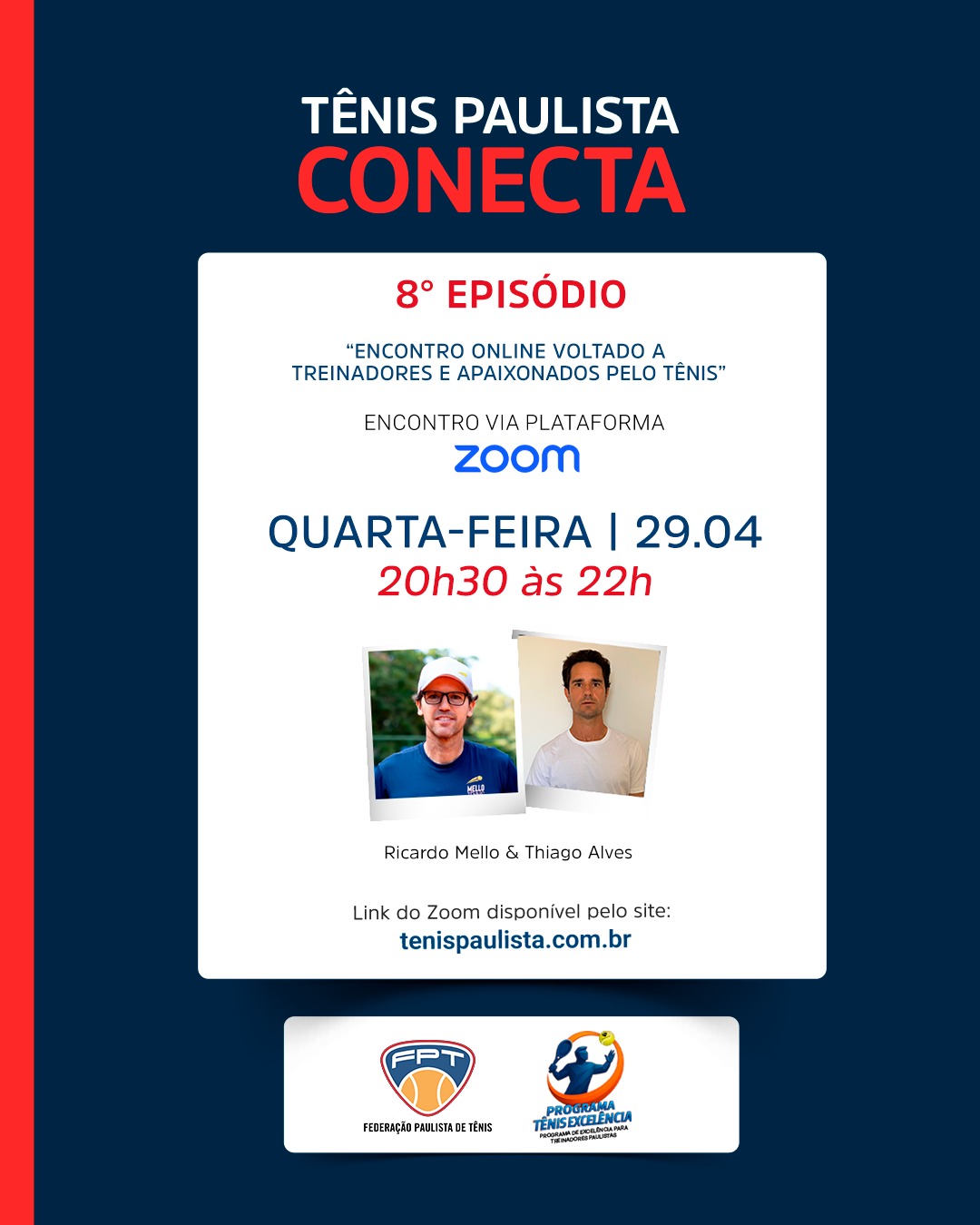 A Federação Paulista de Tênis, por meio do Programa Tênis Excelência para Treinadores Paulistas, promove no próximo dia 29 de abril, das 20h30 às 22h, a oitava edição do Tênis Paulista Conecta.