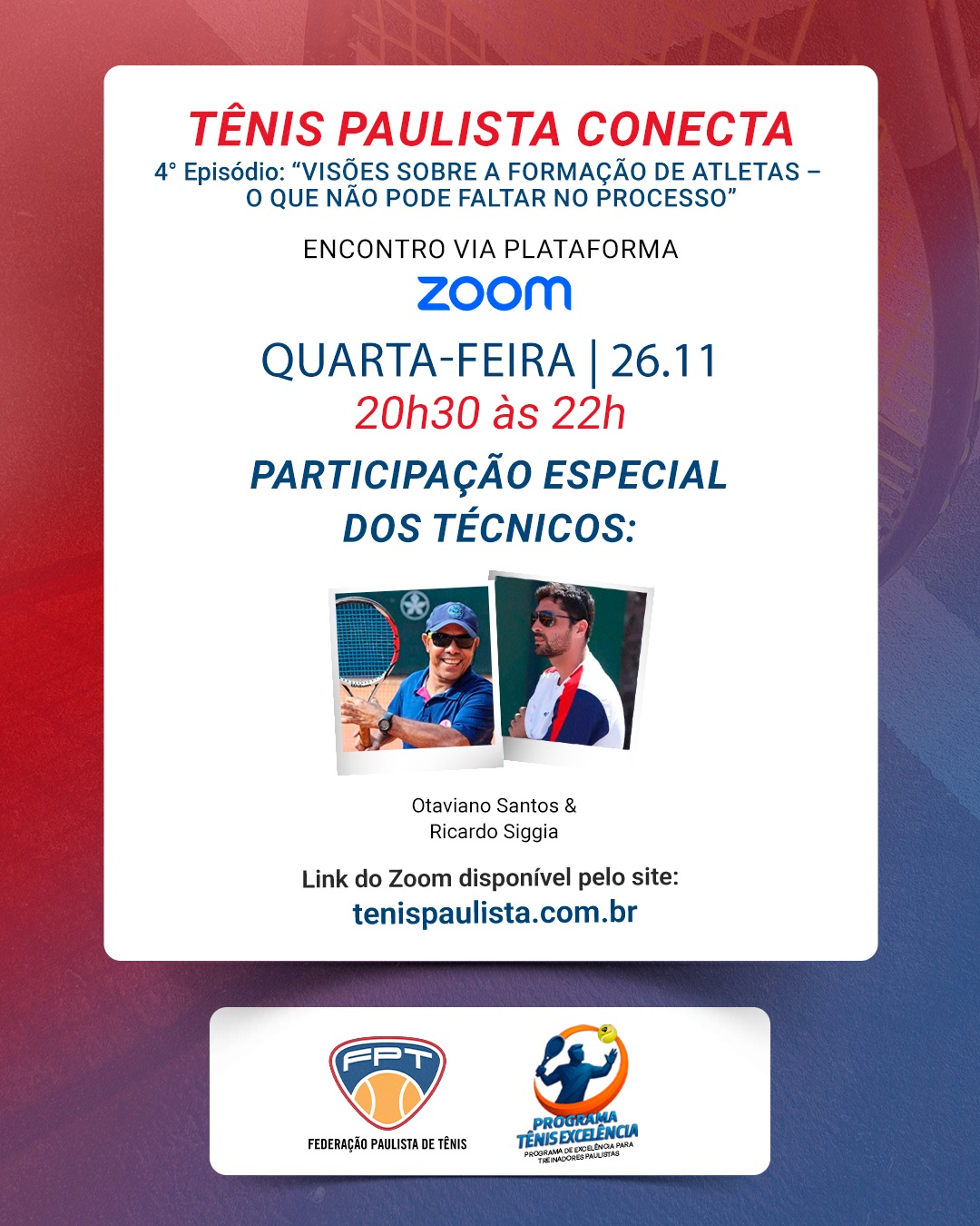 São Paulo (SP) – A Federação Paulista de Tênis (FPT) promove, no próximo dia 26 de novembro, das 20h30 às 22h, a quarta edição do Tênis Paulista Conecta, encontro virtual realizado pela plataforma Zoom e voltado a treinadores, profissionais do esporte e apaixonados pelo tênis.