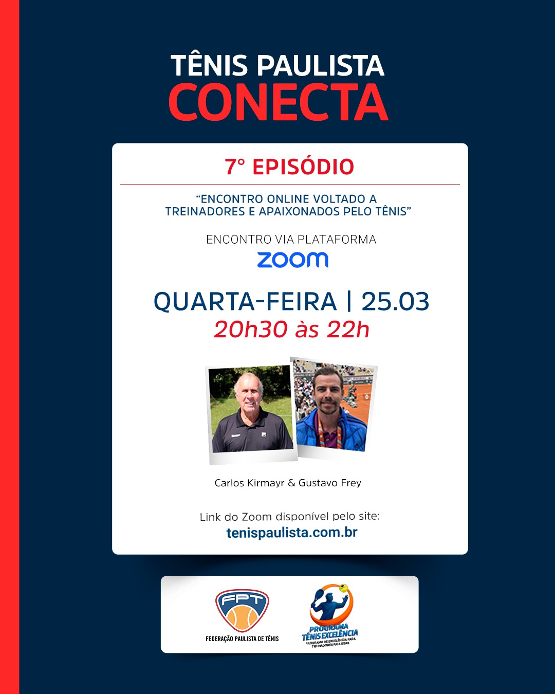 A Federação Paulista de Tênis, por meio do Programa Tênis Excelência para Treinadores Paulistas, promove no próximo dia 25 de março, das 20h30 às 22h, a sétima edição do Tênis Paulista Conecta.